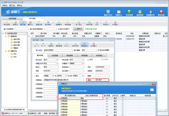 在進銷存軟件中,客戶信息是一個重要的組成部分,它包括客戶的基本信息、聯系方式、地址等。信管飛軟件在錄入客戶信息時,支持多個擴展信息數據項,可自定義錄入需要的內容,如下圖所示,自定義客戶“擴展信息1”數據項錄入客戶“渠道”信息。