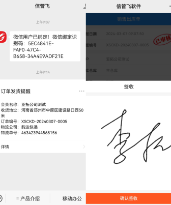 軟件中支持設(shè)置開(kāi)單自動(dòng)發(fā)送微信消息,客戶收到微信消息可點(diǎn)擊詳情查看詳情和收貨進(jìn)行簽收操作。效果如下圖所示: