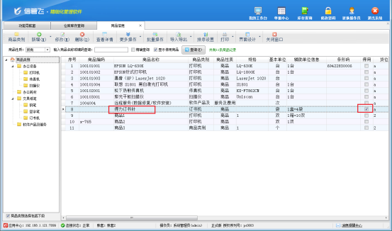 打開商品信息界面,示例商品“得力訂書針”設(shè)置已停用,直接打開倉庫庫存查詢界面無法顯示該商品。