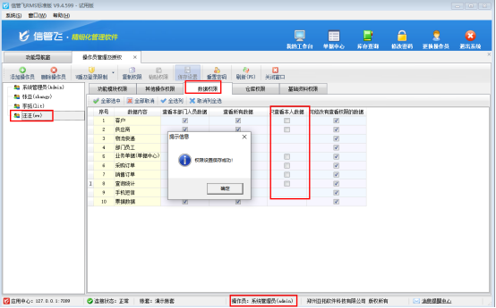 經(jīng)檢查,出現(xiàn)此問題是因?yàn)椴僮鲉T權(quán)限設(shè)置的數(shù)據(jù)權(quán)限影響,在系統(tǒng)管理-操作員及授權(quán)界面。選擇此操作員,打開數(shù)據(jù)權(quán)限,把只查看本人數(shù)據(jù)權(quán)限取消勾選,然后保存操作員權(quán)限,如下圖所示: