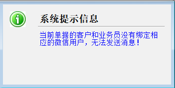 信管飛RMS、信管飛出納記賬軟件、信管飛送貨單軟件均支持微信消息增值服務功能,部分用戶在開單保存單據時會出現以下提示:“當前單據的客戶和業務員沒有綁定相應的微信用戶,無法發送”,如圖: