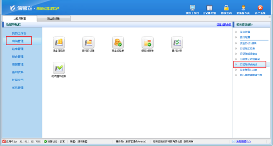 在功能導(dǎo)航窗點擊“出納管理”—》“現(xiàn)金日記賬”,新增日記賬憑證時需要輸入“輔助項目”,然后在“出納管理”模塊最右側(cè)的“相關(guān)查詢統(tǒng)計”內(nèi)點擊“日記賬綜合統(tǒng)計”,如圖所示。