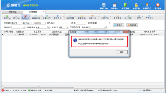 有用戶在刪除預(yù)付款時(shí)可能會(huì)出現(xiàn)業(yè)務(wù)單據(jù)生成的應(yīng)收款記錄,無法直接刪除的情況,如圖,本篇文章介紹一下訂單生成的客戶預(yù)付款記錄,如何刪除?