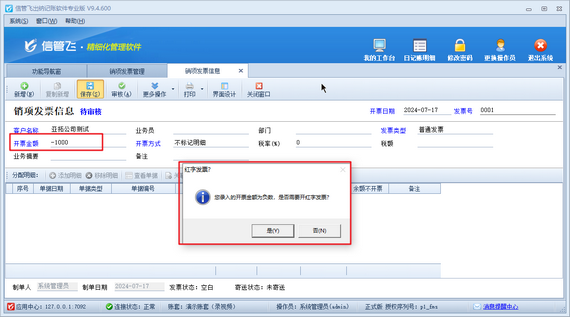 錄入開(kāi)票日期、發(fā)票號(hào)、客戶名稱及開(kāi)票金額等其他信息,如錄入紅字發(fā)票,開(kāi)票金額請(qǐng)錄入負(fù)數(shù),如下圖所示。開(kāi)票金額錄入負(fù)數(shù),保存發(fā)票時(shí),系統(tǒng)會(huì)彈出提示信息“您錄入的開(kāi)票金額為負(fù)數(shù),是否需要開(kāi)紅字發(fā)票?”在彈出的提示信息窗口,點(diǎn)擊“是”確認(rèn)填開(kāi)紅字發(fā)票即可。