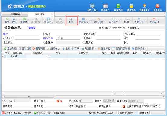 點擊“銷售管理”-》“銷售出庫單”,進入銷售開單界面,工具欄上方點擊“引單”按鈕,選中銷售訂單進行引單,此時引單窗口顯示所有已開訂單單據(jù),如圖: