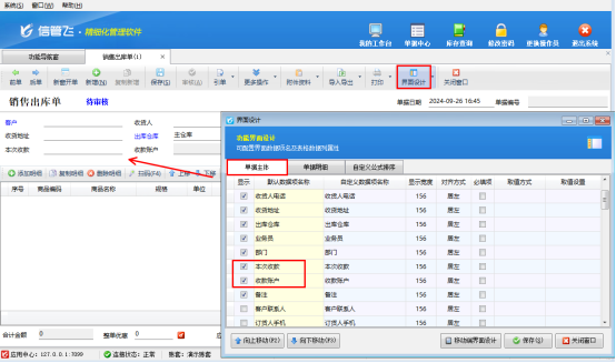 在功能導航窗點擊“銷售管理”,打開銷售出庫單界面,單據主體可輸入本次收款金額和收款賬戶,如果單據主體沒有這兩項,可在工具欄點擊“界面設計”勾選顯示出這兩項,如下圖所示: