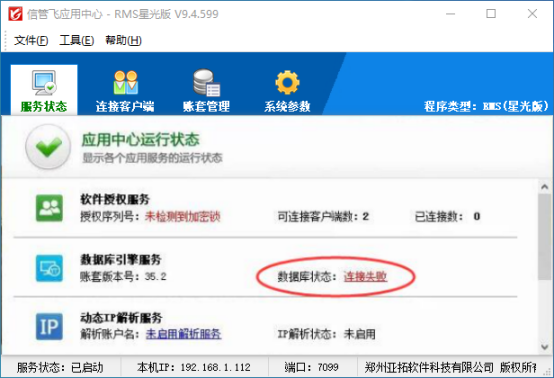 智能修復軟件環(huán)境完成后,請重啟應用中心程序,然后查看下數(shù)據(jù)庫連接狀態(tài)是否顯示為連接成功(如下圖所示),數(shù)據(jù)庫狀態(tài)為連接成功,則軟件即可正常登錄。