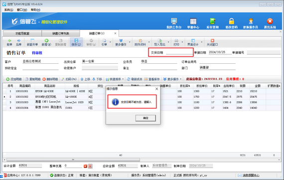 有用戶在使用信管飛軟件時(shí),填開銷售訂單保存不成功,提示“交貨日期不能為空,請輸入”,訂單無法保存,如下圖所示。