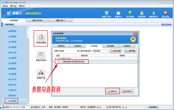 在功能導(dǎo)航窗點(diǎn)擊“系統(tǒng)管理”—》“系統(tǒng)參數(shù)配置”—》“業(yè)務(wù)參數(shù)”打開業(yè)務(wù)參數(shù)配置界面,在業(yè)務(wù)單據(jù)保存參數(shù)內(nèi)取消勾選“訂單保存時(shí)交貨日期不能為空”參數(shù),然后點(diǎn)擊“保存”按鈕保存參數(shù)設(shè)置,如下圖所示。