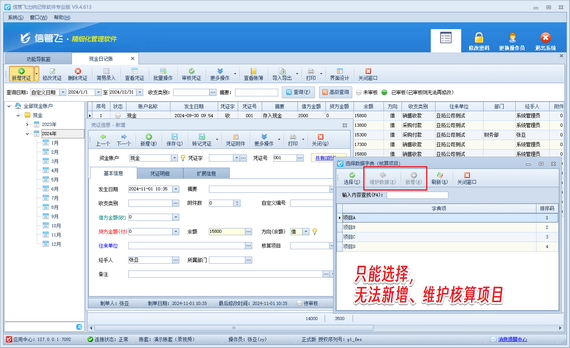 信管飛出納記賬軟件支持在日記賬憑證界面輸入核算項目,也支持按核算項目統計,方便用戶統計不同項目的日記賬信息。有用戶在登記出納憑證時,只能從已維護好的核算項目內容進行選擇,而不能維護、新增核算項目內容,如下圖所示。