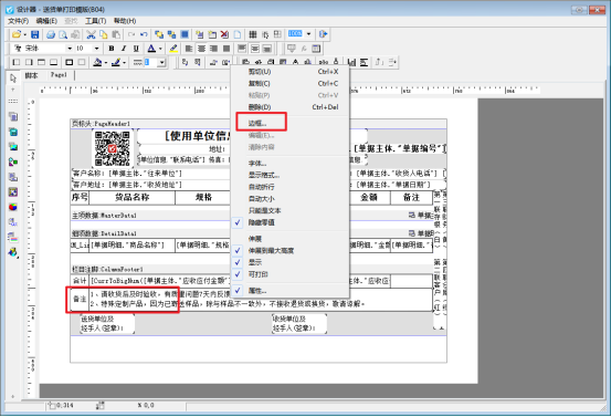 開單界面點“打印”—》“打印格式設計”,選中需要修改的模板,點擊“設計格式”,進入模板設計器界面,依次選中備注文本框,左上方屬性欄可以設置邊框樣式以及邊框線粗細,鼠標右鍵選擇“邊框”,進入邊框屬性窗口,也可對邊框線進行設置。如圖: