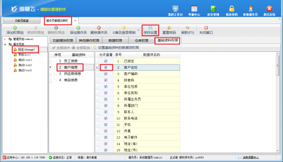 參數(shù)配置成功后,用“系統(tǒng)管理員”賬號登錄軟件,在功能導(dǎo)航窗點(diǎn)擊“系統(tǒng)管理”—》“操作員及授權(quán)”進(jìn)入“操作員管理及授權(quán)”界面,在權(quán)限模塊中可以看到啟用的基礎(chǔ)資料權(quán)限,選中操作員“張亞”,點(diǎn)擊“基礎(chǔ)資料權(quán)限”,選擇客戶信息,把“客戶名稱”允許查看權(quán)限勾選,勾選后保存權(quán)限,如圖: