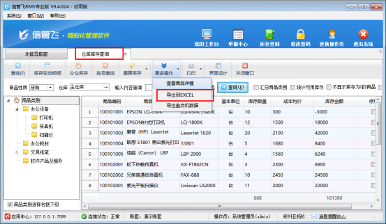 功能導(dǎo)航窗點(diǎn)擊“倉庫管理”,右側(cè)相關(guān)查詢統(tǒng)計(jì)下打開“庫存查詢”界面,如果存在多倉庫,先選擇“倉庫”,在工具欄“更多操作”下選擇“導(dǎo)出到Excel”,導(dǎo)出Excel文件,如下圖所示: