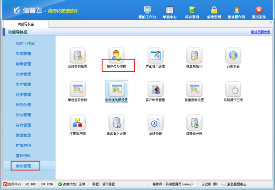功能導航窗點擊“系統(tǒng)管理”—》“操作員及授權”,進入操作員管理及授權界面,選擇操作員“張亞”,功能模塊權限下,找到“銷售查詢”下的“銷售單明細查詢”,把“打印”權限取消勾選,取消后保存權限,如圖: