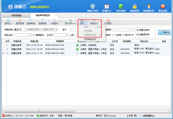 進銷存管理軟件、信管飛倉庫管理軟件、信管飛送貨單軟件、信管飛出納記賬軟件等軟件內都提供的有打印預覽及打印功能,可以打印銷售單、對賬單及各類統(tǒng)計報表。然而,有用戶反映,在銷售單明細查詢界面,他們希望無需操作員手動執(zhí)行打印操作。針對這一需求,本篇文章以“信管飛RMS軟件”為例介紹下如何解決?
