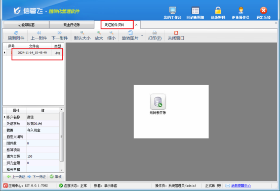信管飛出納記賬軟件在新增或修改憑證時,允許用戶添加文檔、圖表等豐富的附件資料,支持掃描或直接導(dǎo)入與出納憑證相關(guān)的電子文件。這一功能極大地方便了用戶全面、直觀地回溯和查詢?nèi)沼涃~憑證的詳細(xì)信息,有效提升了企業(yè)對日記賬憑證的管理效率。當(dāng)用戶需要在日記賬列表界面快速查看某一憑證的附件時,信管飛出納記賬軟件提供了直接在列表中打開附件資料的便捷功能。本文以“信管飛出納記賬軟件”為例介紹一下如何在日記賬列表界面輕松查看憑證附件?