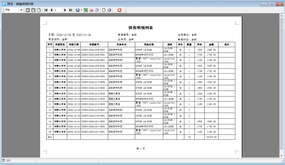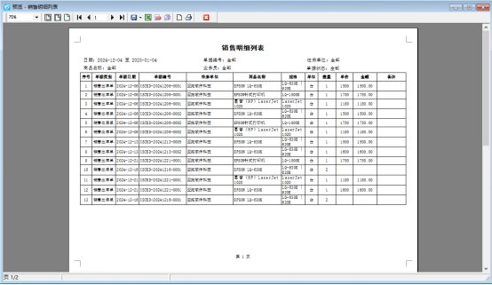 以銷售單明細查詢界面為例,按照往來單位設(shè)置分組顯示打印銷售明細,未設(shè)置時打印預(yù)覽如下顯示: