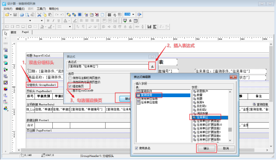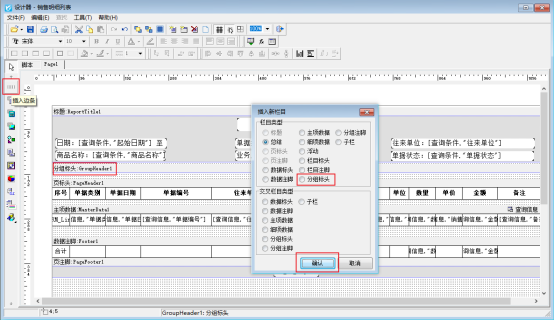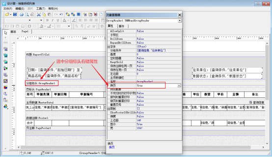 雙擊分組標頭,插入表達式“[查詢信息."往來單位"]”,勾選強迫換頁;選擇分組標頭右鍵點擊屬性,換頁設(shè)置值為“True”。