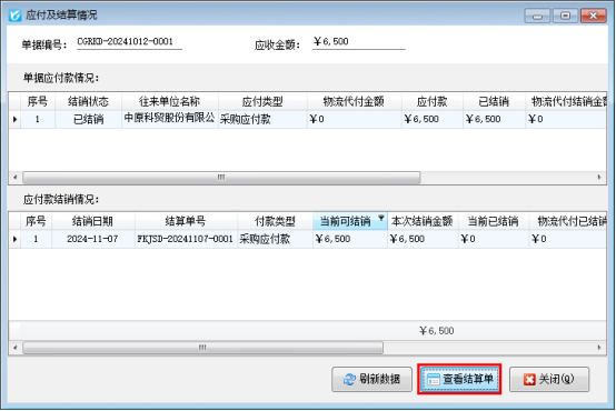 已結(jié)銷(xiāo)應(yīng)付款的單據(jù)需要反審修改,需變?yōu)椤拔唇Y(jié)銷(xiāo)”狀態(tài),快捷操作方式,在采購(gòu)入庫(kù)單界面點(diǎn)擊更多操作下的“查看應(yīng)付款及結(jié)銷(xiāo)情況”,彈出界面點(diǎn)擊“查看結(jié)算單”如下圖所示: