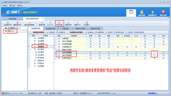 系統(tǒng)管理員登錄軟件,在功能導(dǎo)航窗點(diǎn)擊“系統(tǒng)管理”—》“操作員及授權(quán)”,進(jìn)入“操作員管理及授權(quán)”界面,選擇操作員“張亞”,在其右側(cè)的功能模塊權(quán)限內(nèi)選擇“票據(jù)管理”模塊,將進(jìn)/銷項(xiàng)發(fā)票管理的“導(dǎo)出”權(quán)限勾選取消,然后保存權(quán)限設(shè)置,如下圖所示。