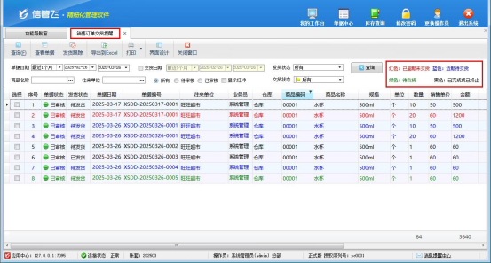 實時狀態(tài)追蹤:紅/藍/綠/黑四色預(yù)警系統(tǒng),清晰區(qū)分超期、近期待交貨、正常待交貨及完成狀態(tài)。