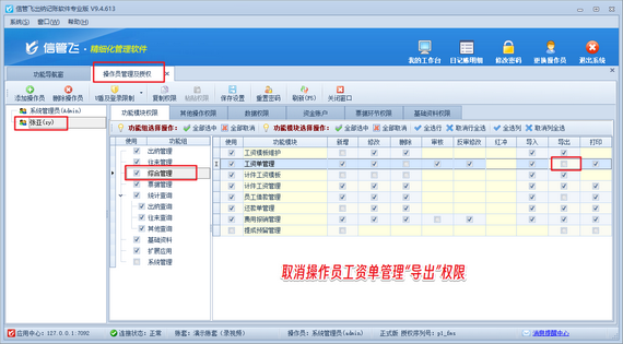 具體操作步驟簡單明了:登錄軟件后,進入“系統(tǒng)管理”的“操作員及授權(quán)”界面,選擇對應(yīng)操作員并取消其工資單管理的“導(dǎo)出”權(quán)限,保存設(shè)置即可。