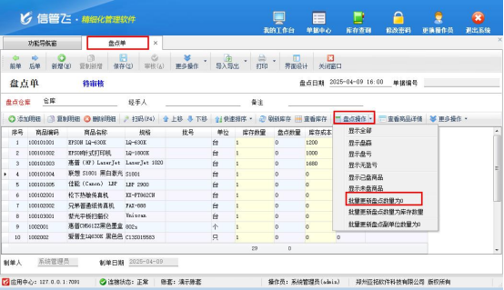 3.批量更新盤點數(shù)量:商品選擇完成后,在明細(xì)工具欄的盤點操作下,選擇 “批量更新盤點數(shù)量為 0”,軟件會直接批量設(shè)置商品盤點數(shù)量為 0,方便又高效。