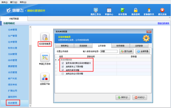 登錄自動(dòng)提示預(yù)警,需要設(shè)置下參數(shù)。功能導(dǎo)航窗點(diǎn)擊“系統(tǒng)管理”,打開(kāi)“系統(tǒng)參數(shù)配置”,業(yè)務(wù)參數(shù)中啟用以下參數(shù):“登錄系統(tǒng)時(shí)彈出系統(tǒng)預(yù)警窗口”、“啟用庫(kù)存上下限預(yù)警”、“啟用負(fù)庫(kù)存預(yù)警”。如下圖所示: