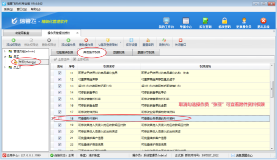 在功能導(dǎo)航窗點(diǎn)擊“系統(tǒng)管理”—》“操作員及授權(quán)”打開操作員管理及授權(quán)界面,選擇操作員賬號,在“其他操作權(quán)限”界面將“可查看附件資料”權(quán)限取消勾選,然后保存權(quán)限設(shè)置,如下圖所示。