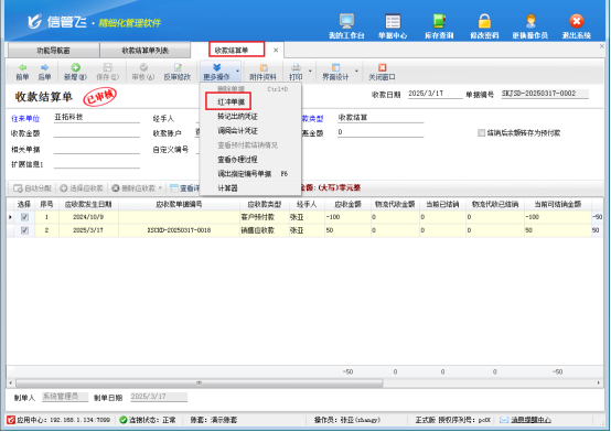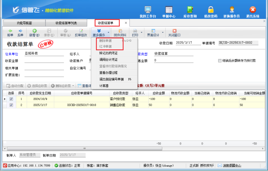 權(quán)限設(shè)置完成后,操作員重新登錄軟件,再次進(jìn)入收款結(jié)算單界面,就會(huì)發(fā)現(xiàn)紅沖刪除按鈕已經(jīng)恢復(fù)正常,可以順利完成相關(guān)操作。