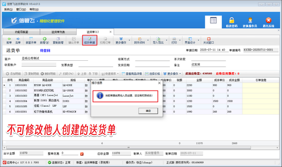 權(quán)限設(shè)置完成后,更換操作員賬號“張亞”重新登錄軟件,即可重新修改他人創(chuàng)建的送貨單,如下圖所示。