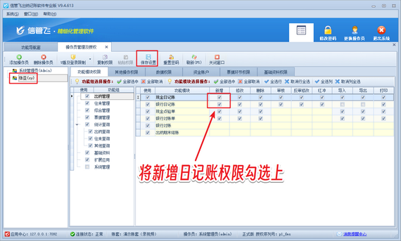 使用系統(tǒng)管理員賬號登錄軟件,在功能導(dǎo)航窗點(diǎn)擊“系統(tǒng)管理”—》“操作員及授權(quán)”打開操作員管理及授權(quán)界面,選擇操作員賬號,在其右側(cè)的功能模塊權(quán)限內(nèi)選擇“出納管理”,將現(xiàn)金(銀行)日記賬的“新增”權(quán)限勾選上,然后保存權(quán)限設(shè)置,如下圖所示。