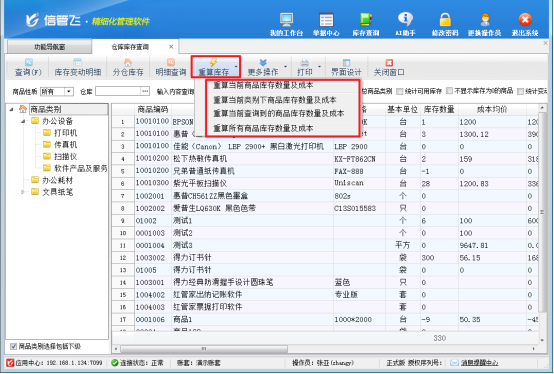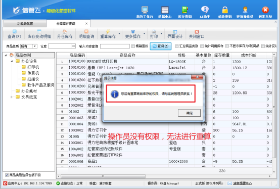 權(quán)限設(shè)置完成后,切換操作員重新登錄軟件。重新進(jìn)入倉庫庫存查詢界面,此時就可以正常進(jìn)行商品庫存重算操作。