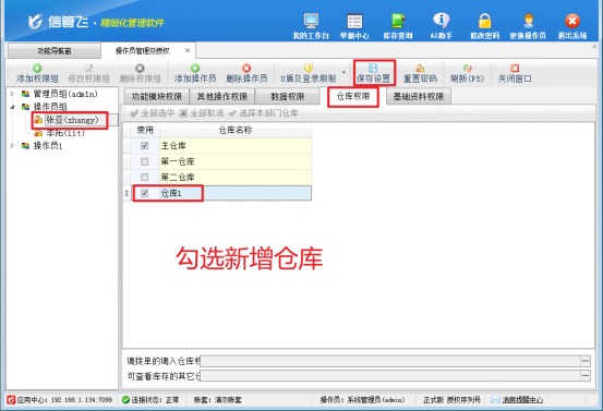 之后點擊“系統管理”—》“操作員及授權”進入操作員管理及授權界面,在權限模塊中可看到啟用的“倉庫權限”,選擇操作員“張亞”,點擊倉庫權限,設置操作員“張亞”勾選使用的倉庫信息權限,保存設置,如圖: