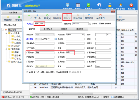 點擊“基礎(chǔ)資料”—“商品信息”,在界面中修改商品信息,輸入擴(kuò)展信息1和2的內(nèi)容并保存,讓每個商品都有詳細(xì)擴(kuò)展信息。
