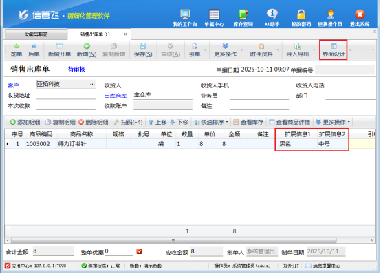 新開單據(jù)時,在界面設(shè)計勾選顯示單據(jù)明細(xì)擴(kuò)展信息。選擇商品名稱,對應(yīng)擴(kuò)展信息自動提取到單據(jù)。例如商品“得力訂書針”,其擴(kuò)展信息1和2能快速顯示在單據(jù)上。