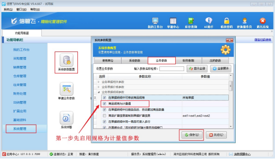打開軟件,進(jìn)入系統(tǒng)參數(shù)設(shè)置界面,找到“商品規(guī)格為計(jì)量值”這一選項(xiàng),輕輕勾選。這一小小的操作,就像是為軟件開啟了一扇通往便捷計(jì)量的大門,為后續(xù)的精準(zhǔn)計(jì)算奠定基礎(chǔ)。具體操作步驟可參考下方圖示: