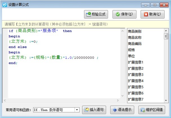1、在單據明細標簽頁的默認列名中找到擴展數值1,自定義列名為立方米。并設置取值方式為“高級計算公式”,取值設置為: