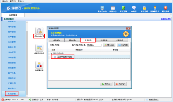 第一步,啟用功能,快速配置。在功能導(dǎo)航窗點(diǎn)擊“系統(tǒng)管理”—“系統(tǒng)參數(shù)配置”,在“業(yè)務(wù)參數(shù)”的特殊功能參數(shù)中,勾選“啟用單據(jù)確認(rèn)功能”,點(diǎn)擊保存即可完成配置。
