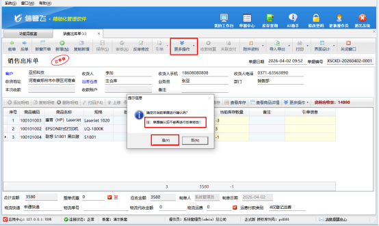 第二步,單據(jù)審核,發(fā)起確認(rèn)。功能啟用后,在銷售管理等模塊新開單據(jù)(以銷售出庫(kù)單為例),完成單據(jù)填寫、保存并審核后,點(diǎn)擊單據(jù)界面的“更多操作”,選擇“確認(rèn)單據(jù)”選項(xiàng),系統(tǒng)會(huì)自動(dòng)彈出提醒“單據(jù)確認(rèn)后不能再進(jìn)行反審修改!”,雙重提醒規(guī)避誤操作,確保用戶在確認(rèn)前充分知曉操作后果。