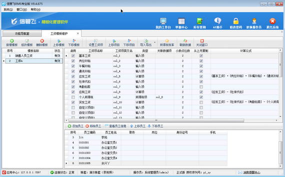 進入維護界面:在功能導航窗點擊“綜合管理”—》“工資模板維護”,打開工資模板維護界面。