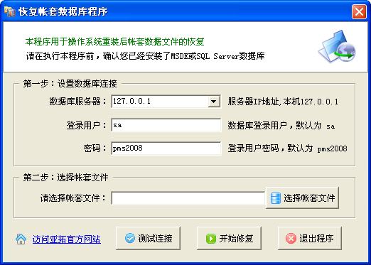 本程序可以在您重新安裝操作系統后,恢復帳套數據庫,支持新陽天進銷存系統、好好用財務出納記賬系統、好好用日記賬系統等全系列系統。如果您的機器無法啟動,有沒有備份的帳套數據文件(后綴名為.pmd)或者很久沒有備份過,可以通過本工具將帳套數據文件(后綴名為.mdf)直接恢復。此程序為最新版本 2001.05.26下載地址: http://www.yatsoft.com/download/DBTools.