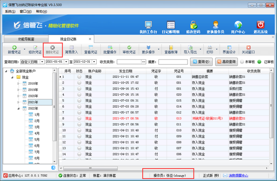 出納記賬軟件支持登記現金(銀行)日記賬,已保存的日記賬如有填寫錯誤,支持刪除,已審核的出納日記賬需反審后可進行刪除操作,本篇文章介紹一下如何設置操作員賬號不可刪除出納日記賬。 登錄軟件,在功能導航窗點擊“系統管理”—》“操作員及授權”,進入“操作員管理及授權”界面,選擇操作員“張亞”,在其右側的功能模塊權限內選擇“出納管理”