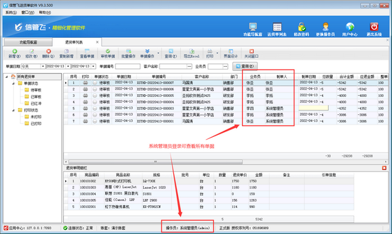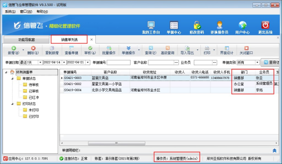 信管飛倉庫管理軟件、信管飛送貨單軟件、信管飛RMS軟件,都支持設置多個操作員并對操作員進行權限控制,通過設置操作員的“數據權限”,可以更精細的控制操作員對業務單據的查看權限。有用戶需要操作員只能查看本部門人員單據,以“信管飛倉庫管理軟件”為例,示范下如何操作? 示例:操作員“系統管理員”和操作員“張亞