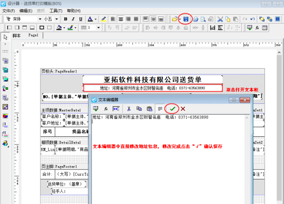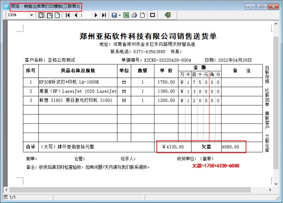信管飛送貨單軟件、信管飛RMS軟件等可開銷售單和打印銷售單,軟件中默認有十幾種打印模板格式,有用戶需要在打印模板上體現客戶的欠款信息,內置模板中沒有此數據項,本文以內置模板進行示范如何添加客戶欠款數據項。 新開一個送貨單并保存,選擇客戶“亞拓軟件測試”開單,界面上顯示應收款為1750(本單前應收款),