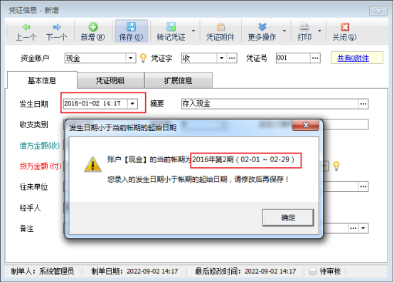 出納記賬軟件登記日記賬憑證時,發生日期默認取電腦操作系統日期,另外如需要補錄出納憑證,系統也支持修改日記賬憑證的發生日期進行補錄出納憑證,部分用戶在修改完日記賬發生日期保存憑證時可能會出現“您錄入的發生日期小于賬期的起始日期,請修改后再保存!”的提示,這是因為該憑證錄入的發生日期小于該賬戶賬期的起始日期導致的。本篇文章介紹一下該如何解決這個問題。&