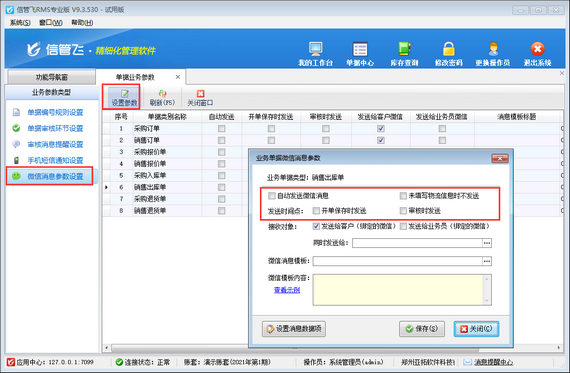 微信消息服務是信管飛軟件基于微信開放平臺研發的業務消息發送服務,支持即時推送業務單據消息,如訂單通知、發貨信息等。支持客戶查看消息詳情(可配置外部查看數據項)、單據簽收確認、分享轉發等功能。 推送微信消息接收人員支持推送給業務員、客戶,支持將綁定客戶微信二維碼打印到送貨單上面,客戶通過掃描送貨單上面的綁定客戶微信二維碼進行綁