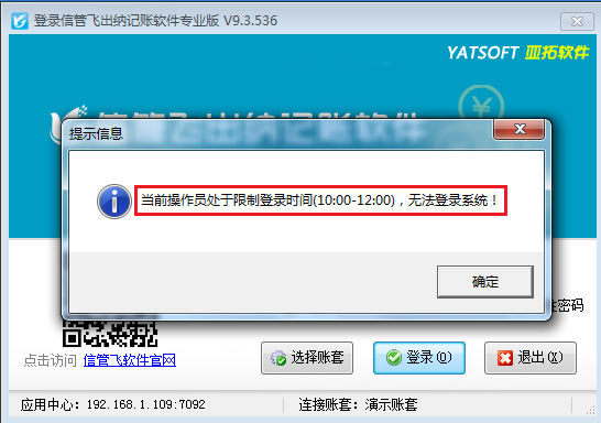 此文章演示視頻觀看鏈接:[InstallDir_ChannelDir]video/202301/1858.html 為了使用戶可以更好的管理公司賬套數據,信管飛RMS、信管飛出納記賬軟件、信管飛倉庫管理軟件都支持設置操作員的登錄限制,系統管理員可以自定義設置操作員登錄軟件的時間,設置后,操作員在受限制