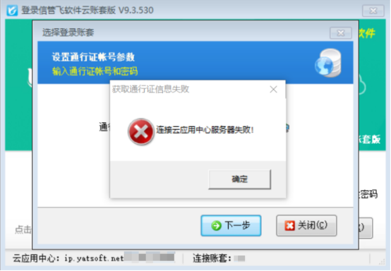 演示視頻觀看鏈接: 云賬套登錄提示“連接云應用中心服務器失敗!”,如何解決演示視頻 部分用戶在登錄云賬套時可能會出現登錄不成功,彈出如下“連接云應用中心服務器失敗!”的提示: 出現此種提示一般是