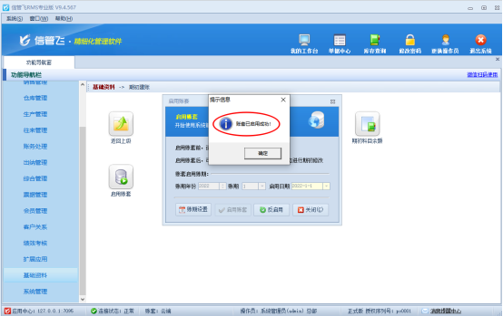 演示視頻觀看鏈接:RMS專業版存在期初庫存啟用賬套啟用不了如何解決? 信管飛RMS專業版支持財務處理模塊,存在會計科目。新用戶使用軟件時,在賬套啟用前錄入了期初入庫單,錄入庫存數量和成本,保存后在賬套啟用界面點擊啟用賬套,會提示如圖以下消息,啟用不了賬套。